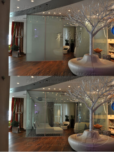 在建筑装修行业中,可以结合现今流行的LED照明系统展演灯光色彩变化效果。既有良好采光功能和视线遮蔽功能,又具有一定的节能性和色彩缤纷、绚丽的装饰效果,是普通透明玻璃或着色玻璃无法比拟的真正的新技术产品,具有无限宽广的应用前景。请登陆网站www.polytron.com.tw了解更多产品详情。